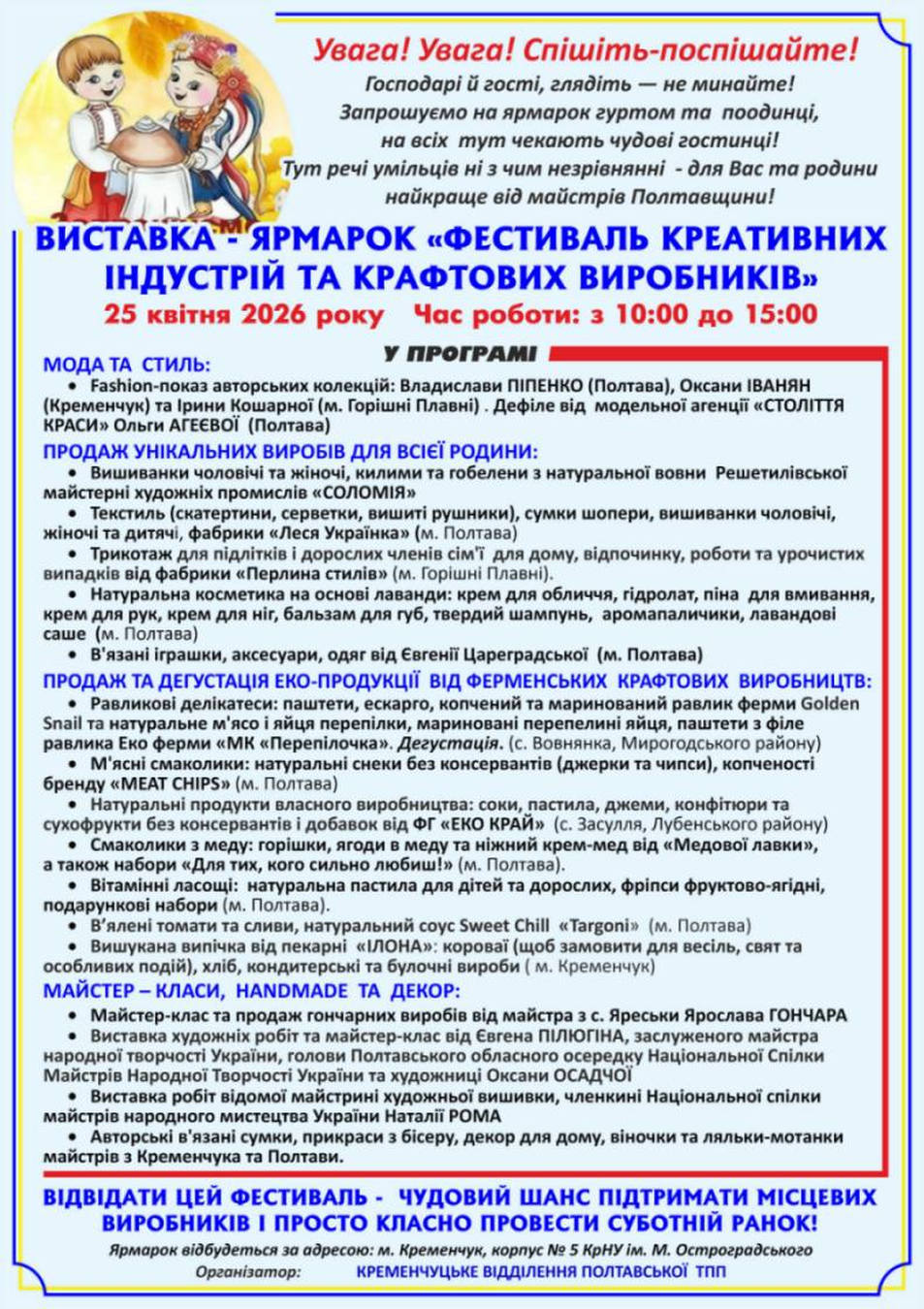 25 квітня 2025 року в приміщенні п’ятого корпусу КрНУ ім. Михайла Остроградського відбулася виставка-ярмарок «Фестиваль креативних індустрій та крафтових виробництв», котра зібрала справжнє сузір’я талантів: унікальних крафтових виробників, майстрів та дизайнерів одягу з різних куточків Полтавщини.