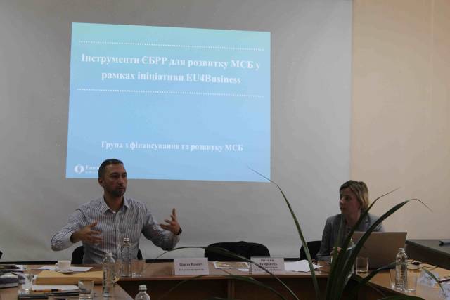 Під час зустрічі представники ЄБРР Наталія Назаровець та Павло Вдович розповіли про умови залучення фінансування від ЄБРР для розвитку МСБ в Україні за підтримки грантової програми Європейського Союзу EU4Business. Детально ознайомили бізнесменів з умовами прямого фінансування підприємств та розповіли про можливу допомогу підприємцям у формі бізнес-консультацій із залученням, як українських так і міжнародних консультантів.