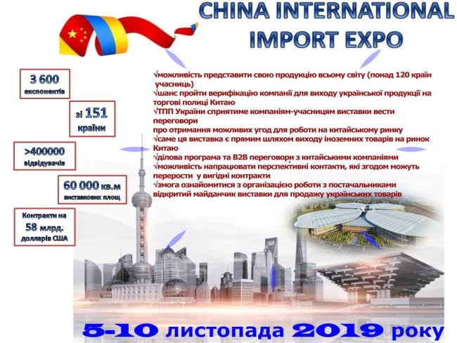 5-10 листопада 2019 року в Шанхаї відбудеться Друга виставка імпортних товарів і послуг – China International Import Expo – найбільший захід Китаю за підтримки керівництва та Уряду Китаю, урядів провінцій, міністерств і відомств, дипломатичних місій країни за кордоном та профільних асоціацій.