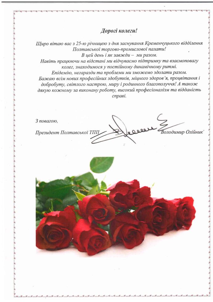 20 червня 2020 року Кременчуцькому відділенню Полтавської Торгово - промислової палати виповнюється 25 років.