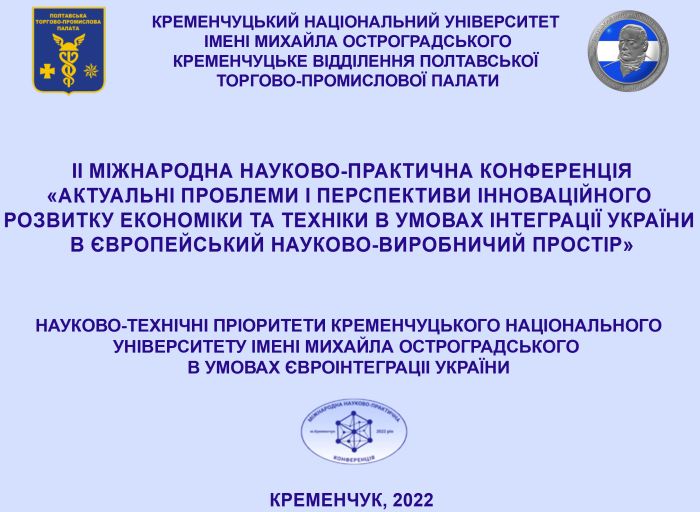 9 червня 2022 року на базі Кременчуцького відділення Полтавської ТПП відбулася ІІ Міжнародна науково-практична конференція "Актуальні проблеми та перспективи інноваційного розвитку економіки і техніки в умовах інтеграції України в Європейський науково-виробничий простір" (посвідчення про реєстрацію в УкрІНТЕІ № 905 від 08.11.2021 р.).