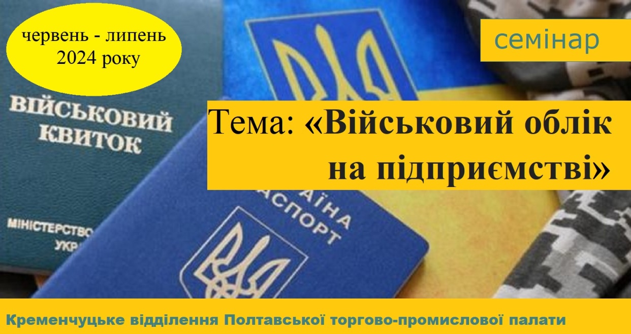 Кременчуцьке відділення Полтавської ТПП у червні - липні 2024 року планує проведення семінару на тему «Військовий облік на підприємстві». Запрошуємо спеціалістів Вашого підприємства прийняти участь у цьому заході.